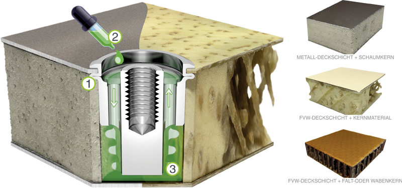 SECAMnida® – ist ein punktförmig lösbares Verbindungselement in Sandwich- oder Wabenkernstrukturen (Alu, GFK und CF-Decklage) mit Form-, Kraft und Stoffschluss.