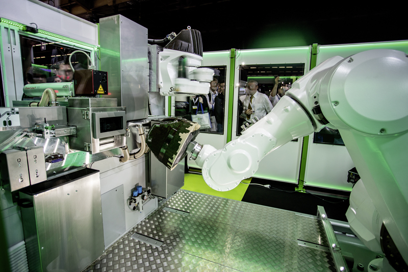 Fiber Patch Placement (FPP) is the advanced technology for the automated fiber lay-up of geometrically complex composites and reinforcements. Defined fiber pieces (patches) are automatically cut from a tape and accurately positioned on a previously calculated position with the aid of two robots and a flexible patch gripper.